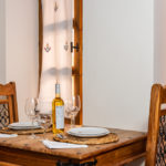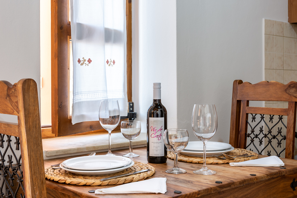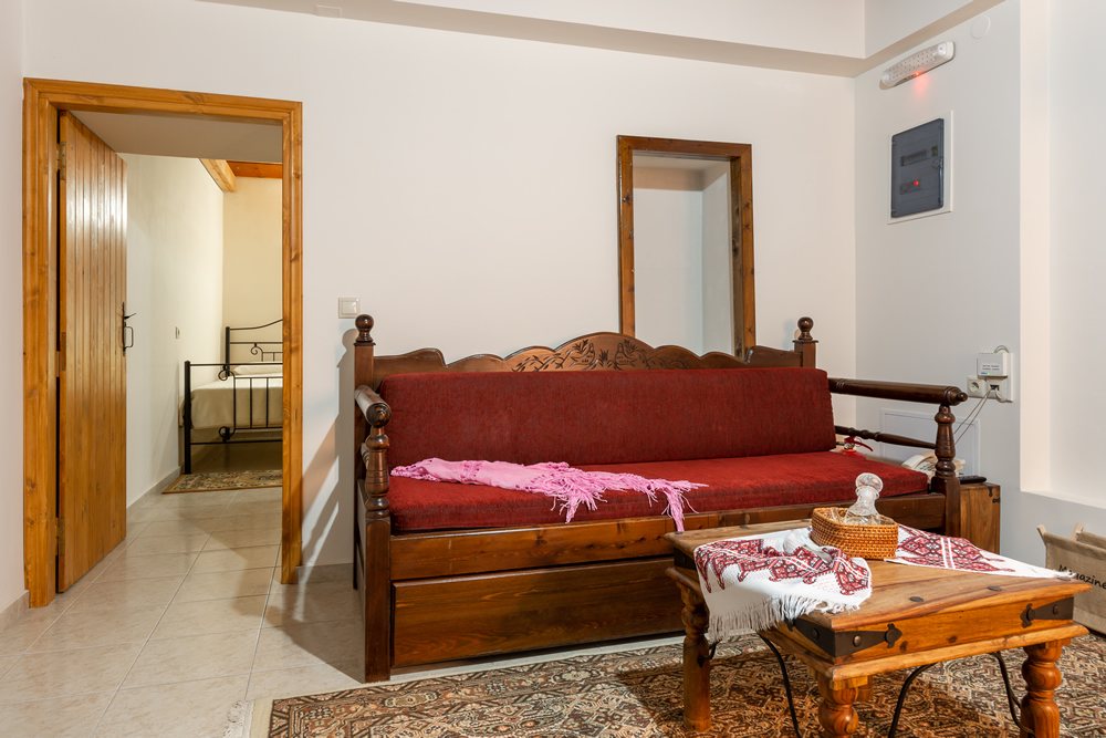 Die Dekoration der Wohnung mit echtem kretischen Stil mit Holzdecken, handgefertigten Holzmöbeln, traditionellem Weben, Stickereien und Gemälden.