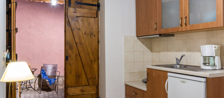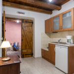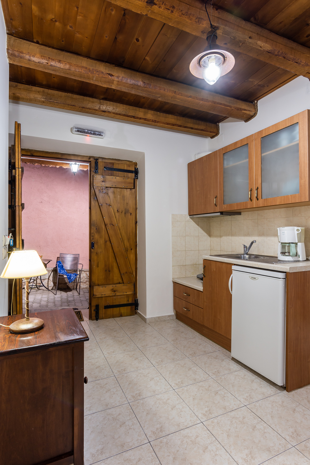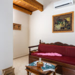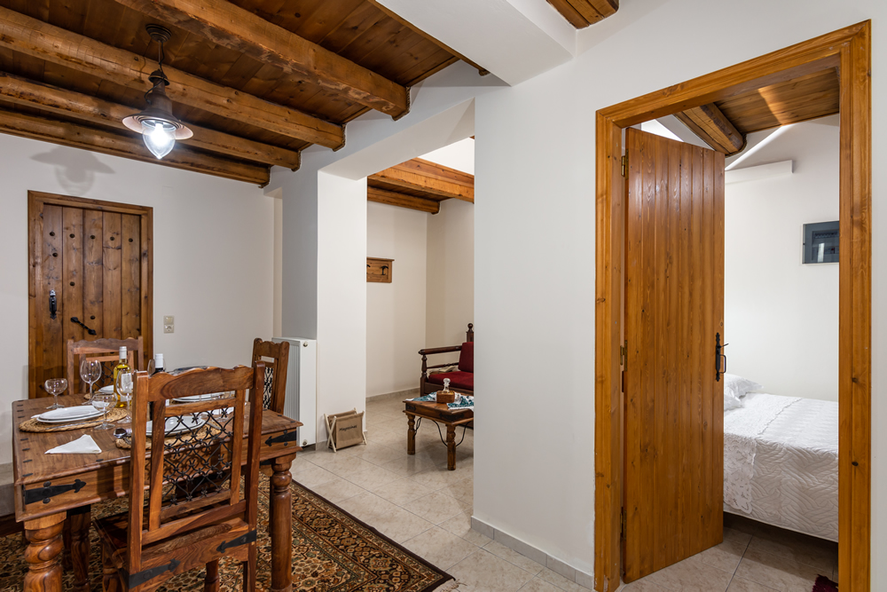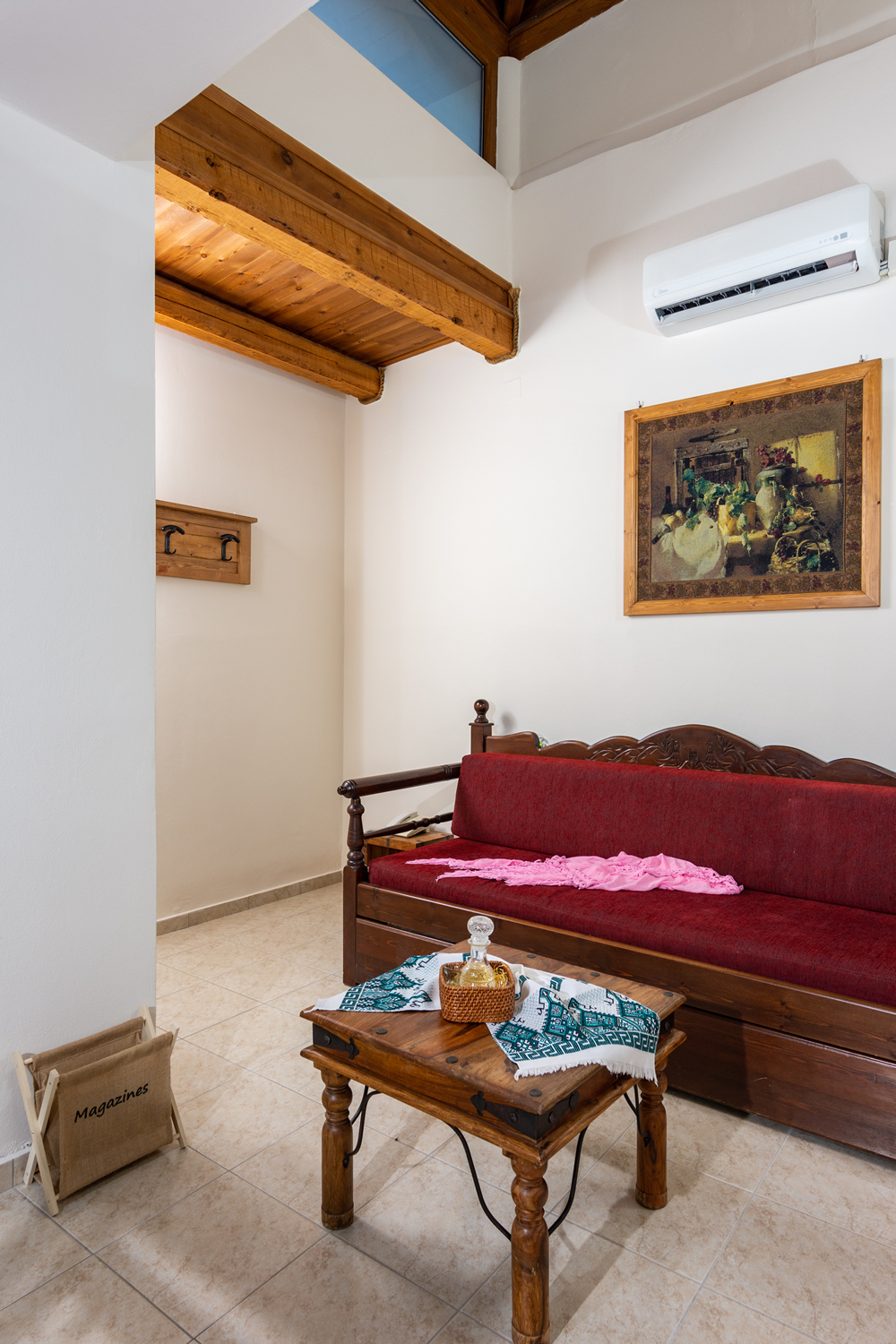 Die Dekoration der Wohnung mit echtem kretischen Stil mit Holzdecken, handgefertigten Holzmöbeln, traditionellem Weben, Stickereien und Gemälden.