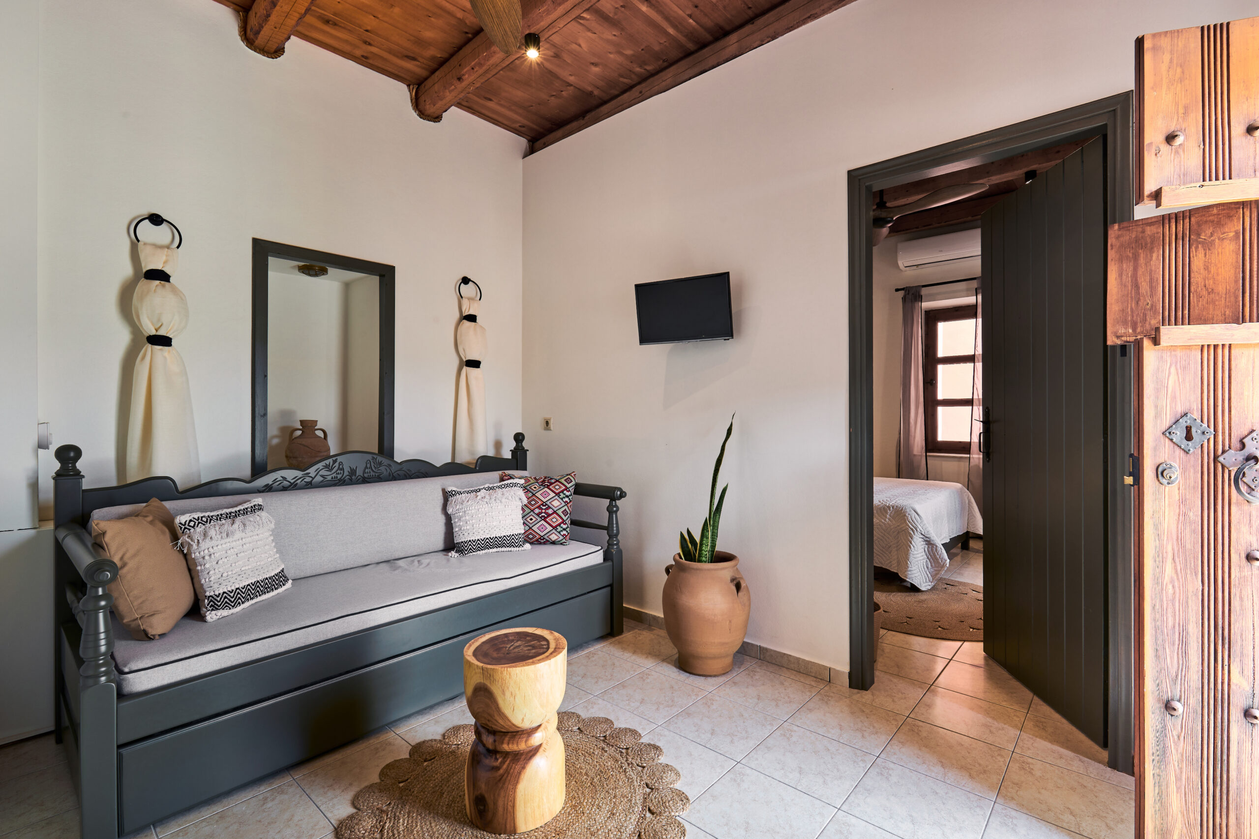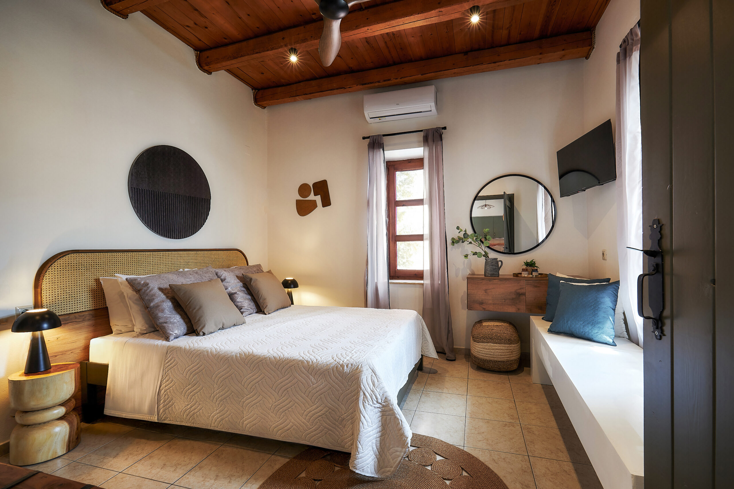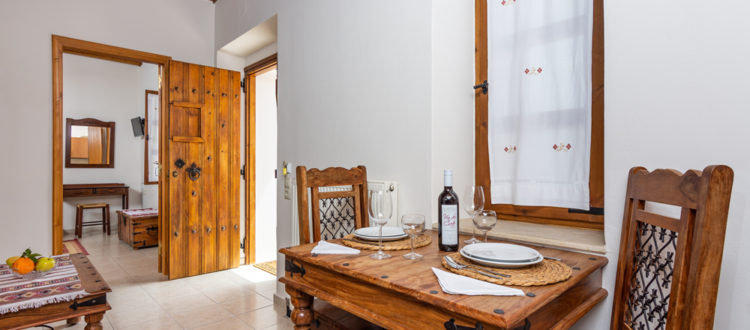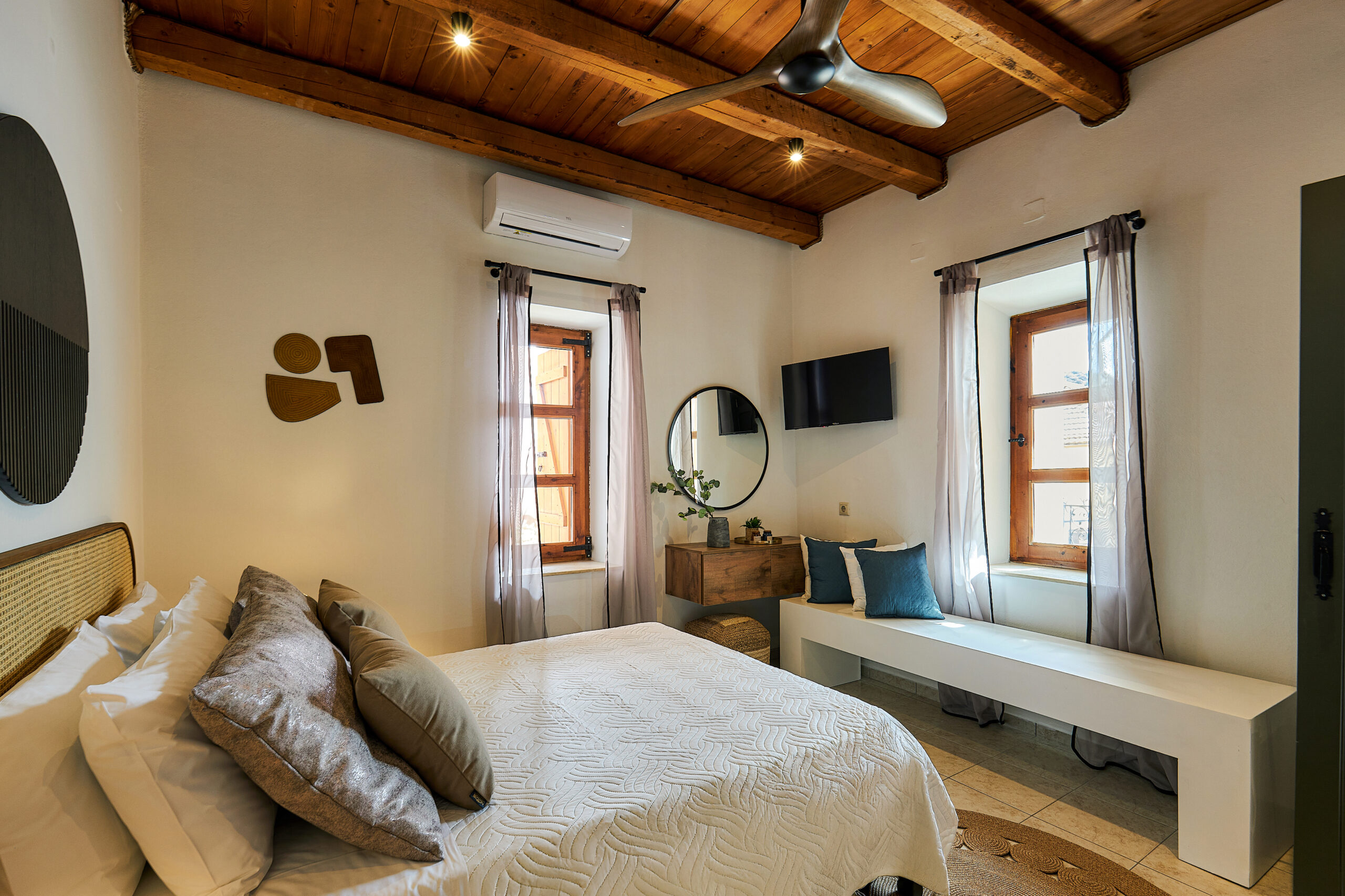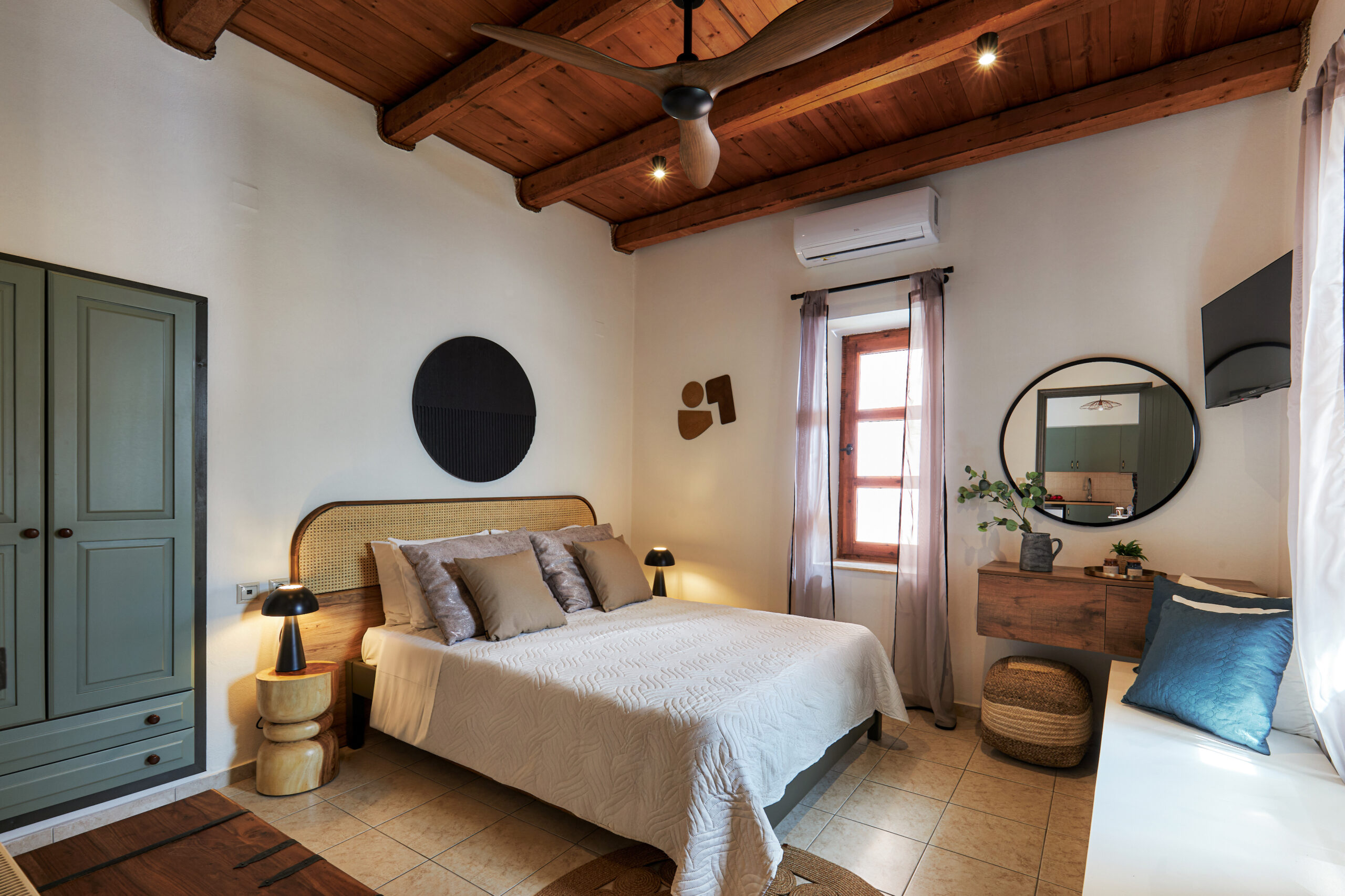 Η διακόσμηση του διαμερίσματος παραπέμπει στη γνήσια κρητική αισθητική με ξύλινα ταβάνια, χειροποίητα ξύλινα έπιπλα, παραδοσιακά υφαντά,κεντητά και πίνακες.
