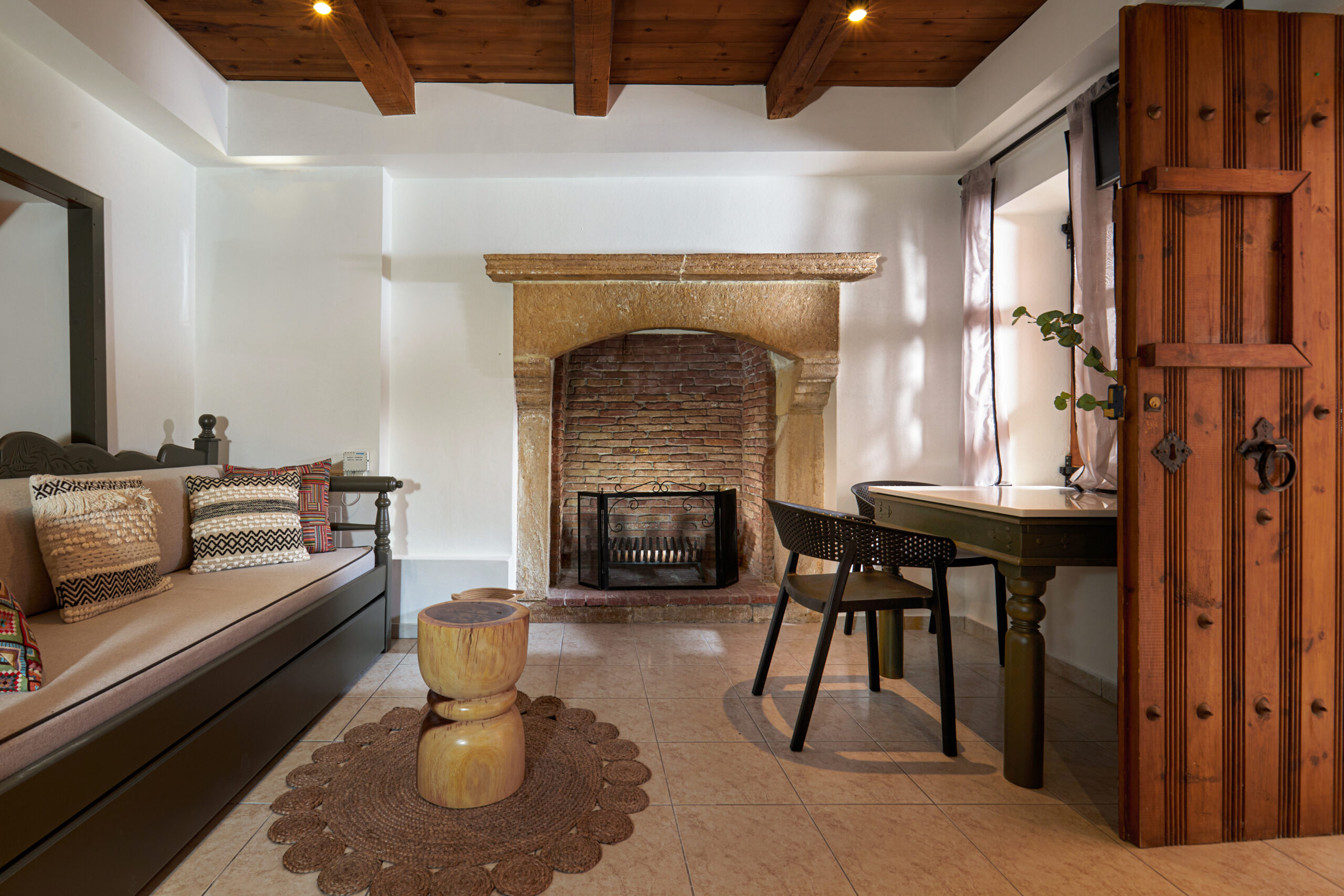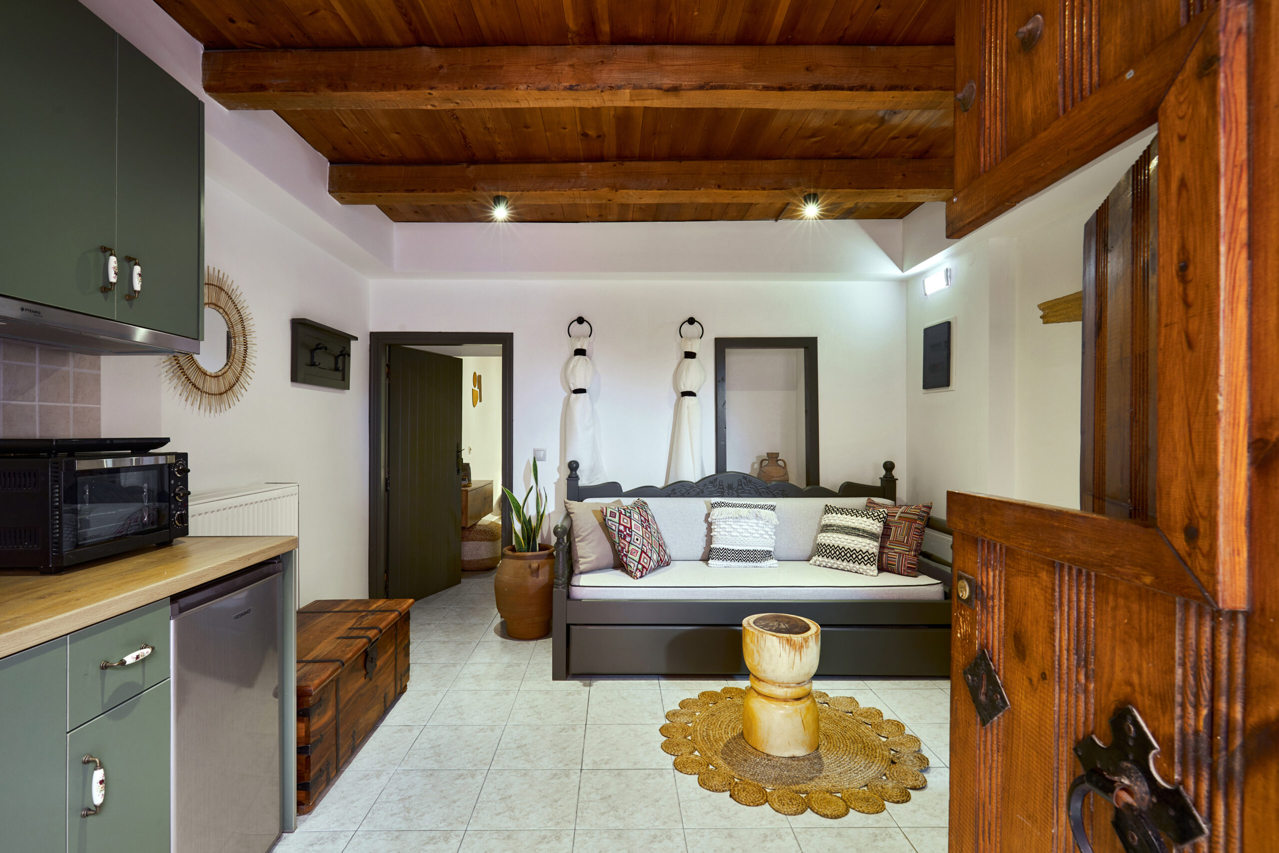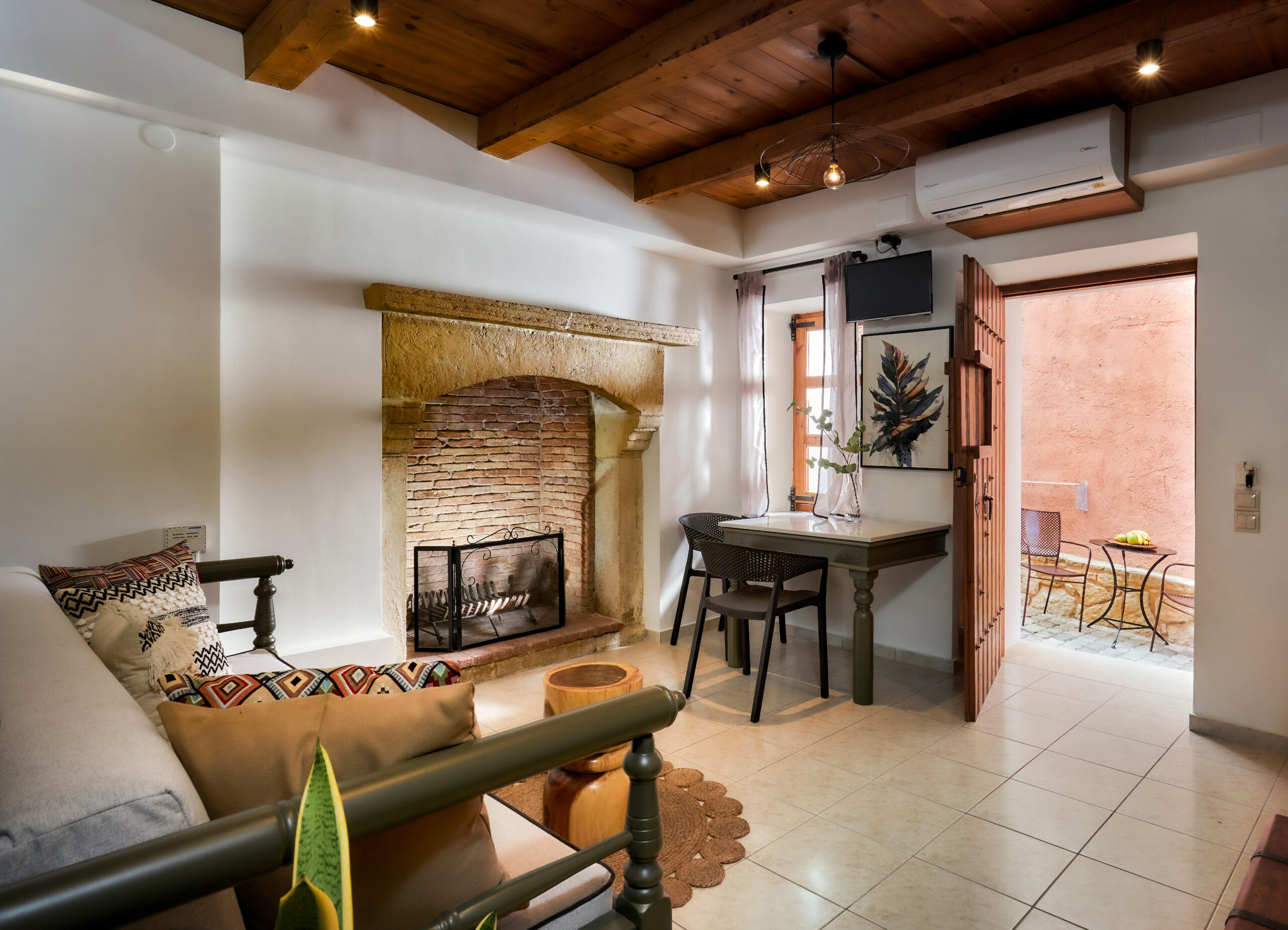 Η διακόσμηση του διαμερίσματος παραπέμπει στη γνήσια κρητική αισθητική με ξύλινα ταβάνια, χειροποίητα ξύλινα έπιπλα, παραδοσιακά υφαντά,κεντητά και πίνακες.