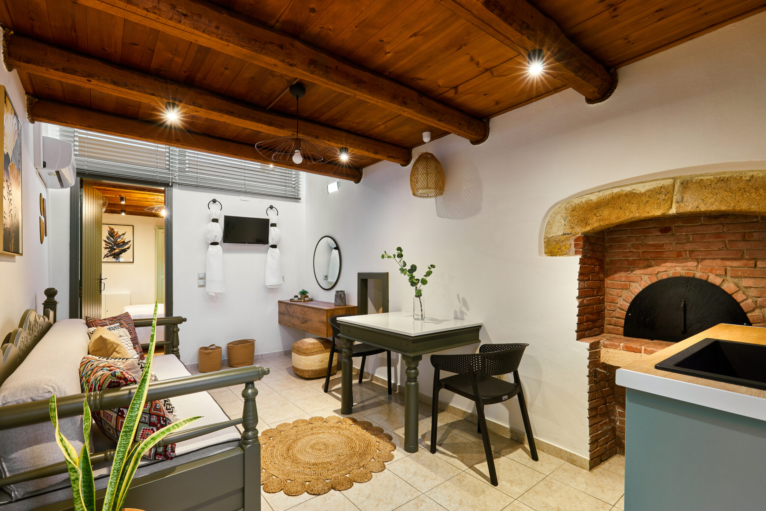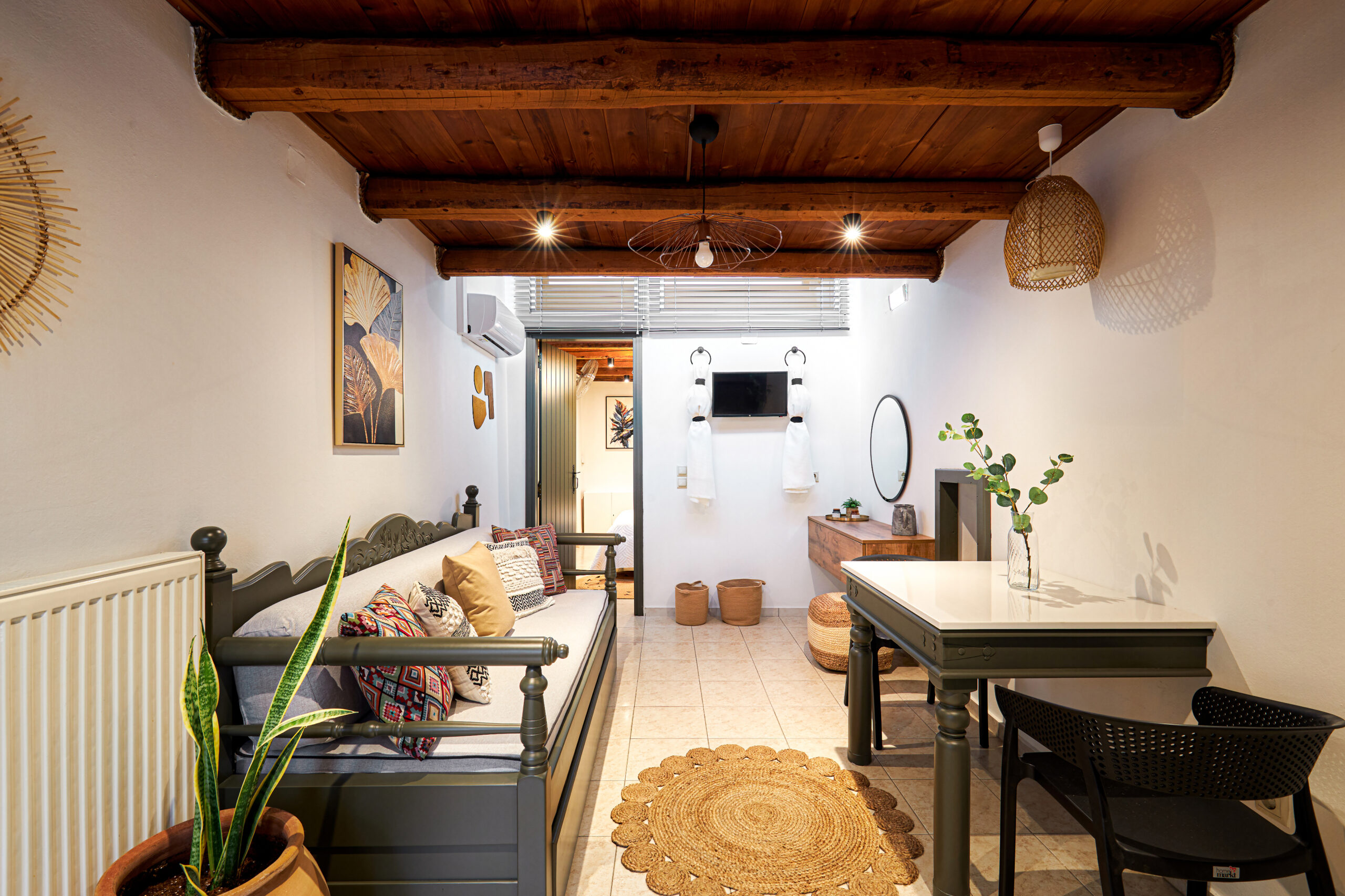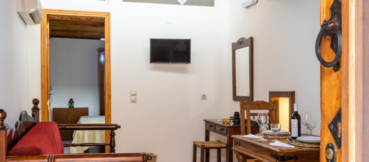 Η διακόσμηση του διαμερίσματος παραπέμπει στη γνήσια κρητική αισθητική με ξύλινα ταβάνια, χειροποίητα ξύλινα έπιπλα, παραδοσιακά υφαντά,κεντητά και πίνακες.