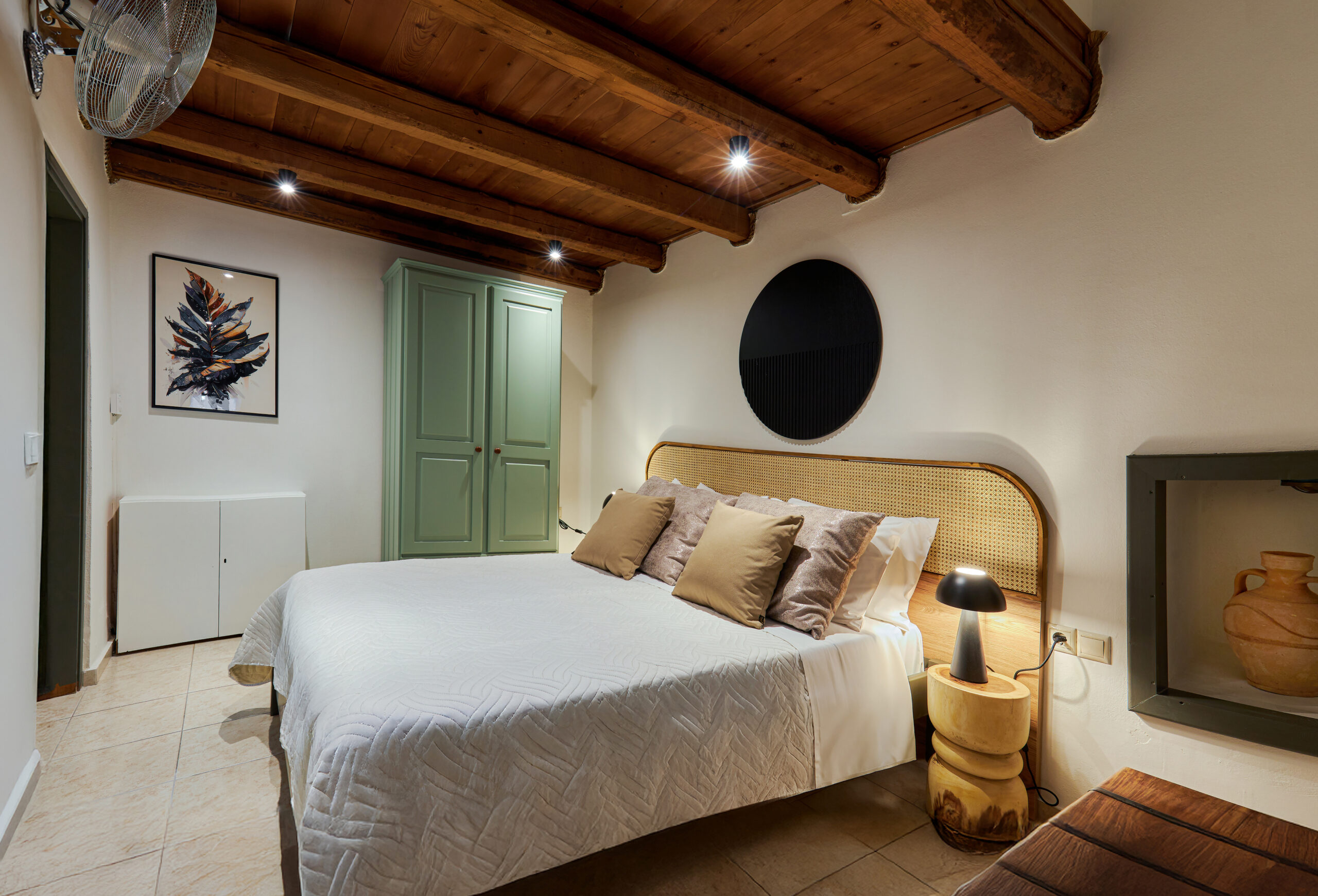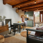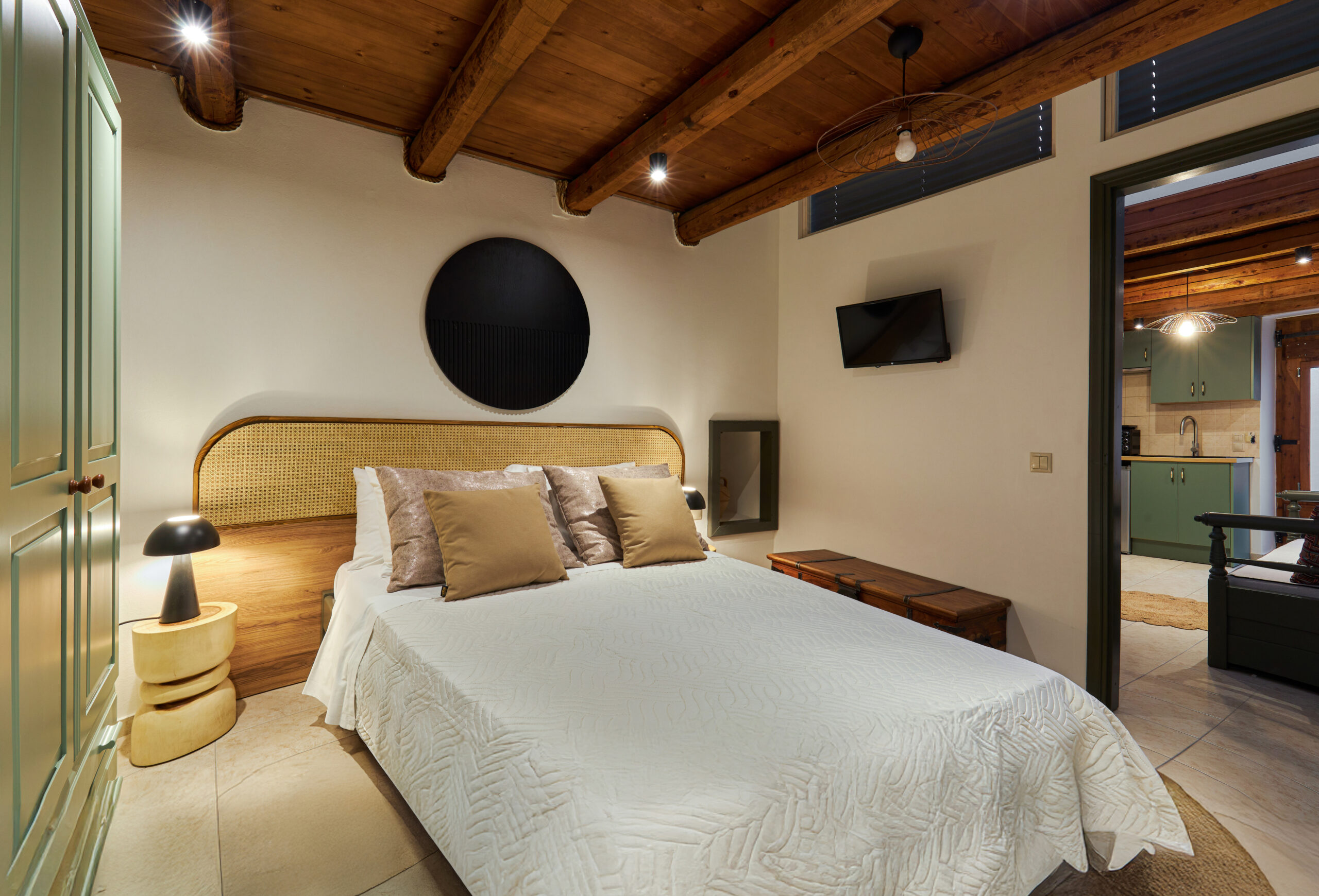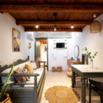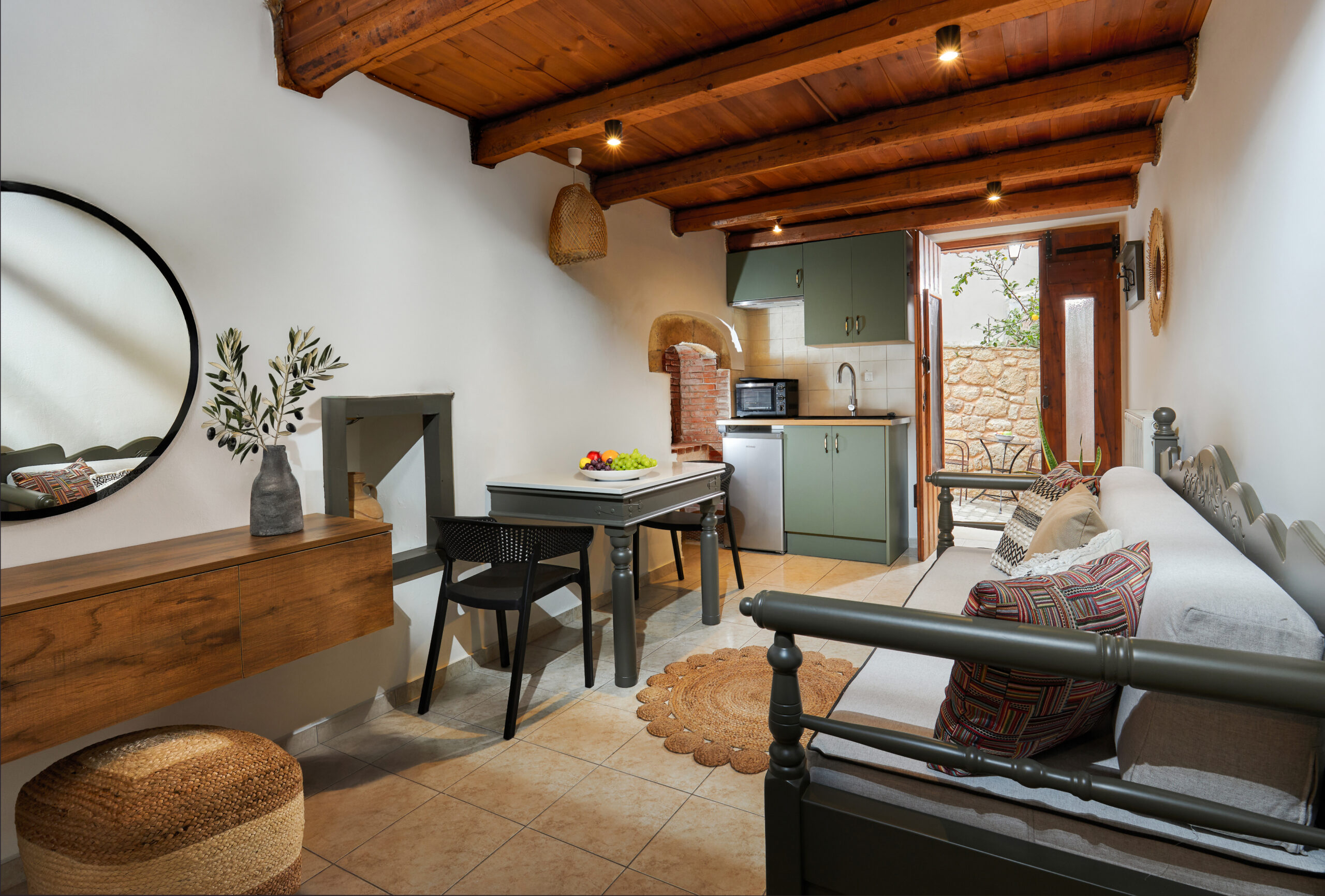 Η διακόσμηση του διαμερίσματος παραπέμπει στη γνήσια κρητική αισθητική με ξύλινα ταβάνια, χειροποίητα ξύλινα έπιπλα, παραδοσιακά υφαντά,κεντητά και πίνακες.