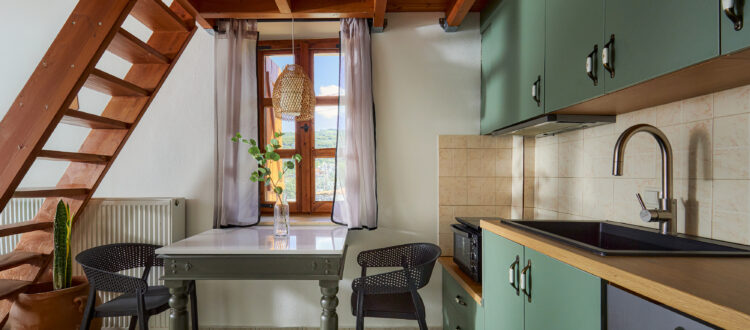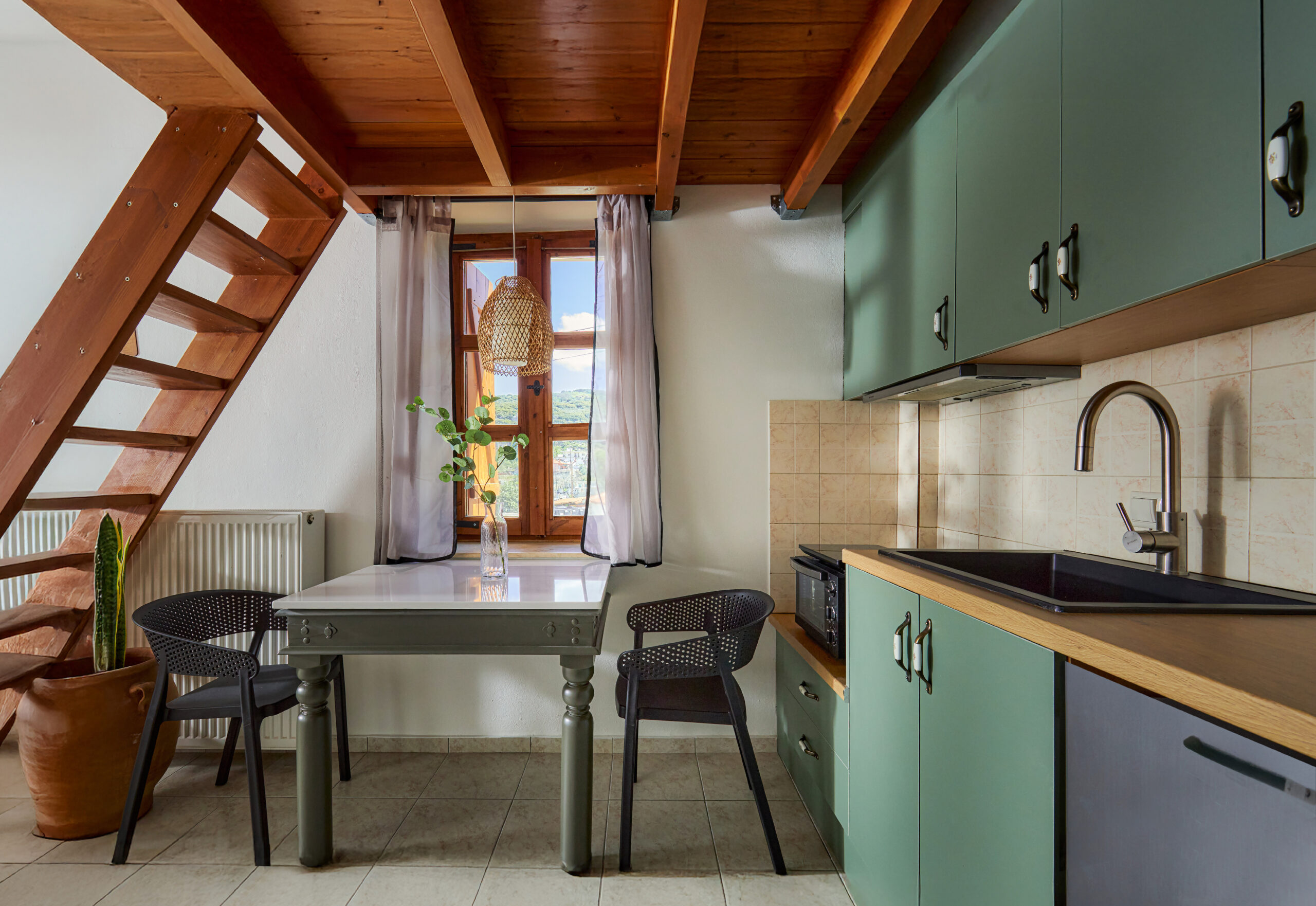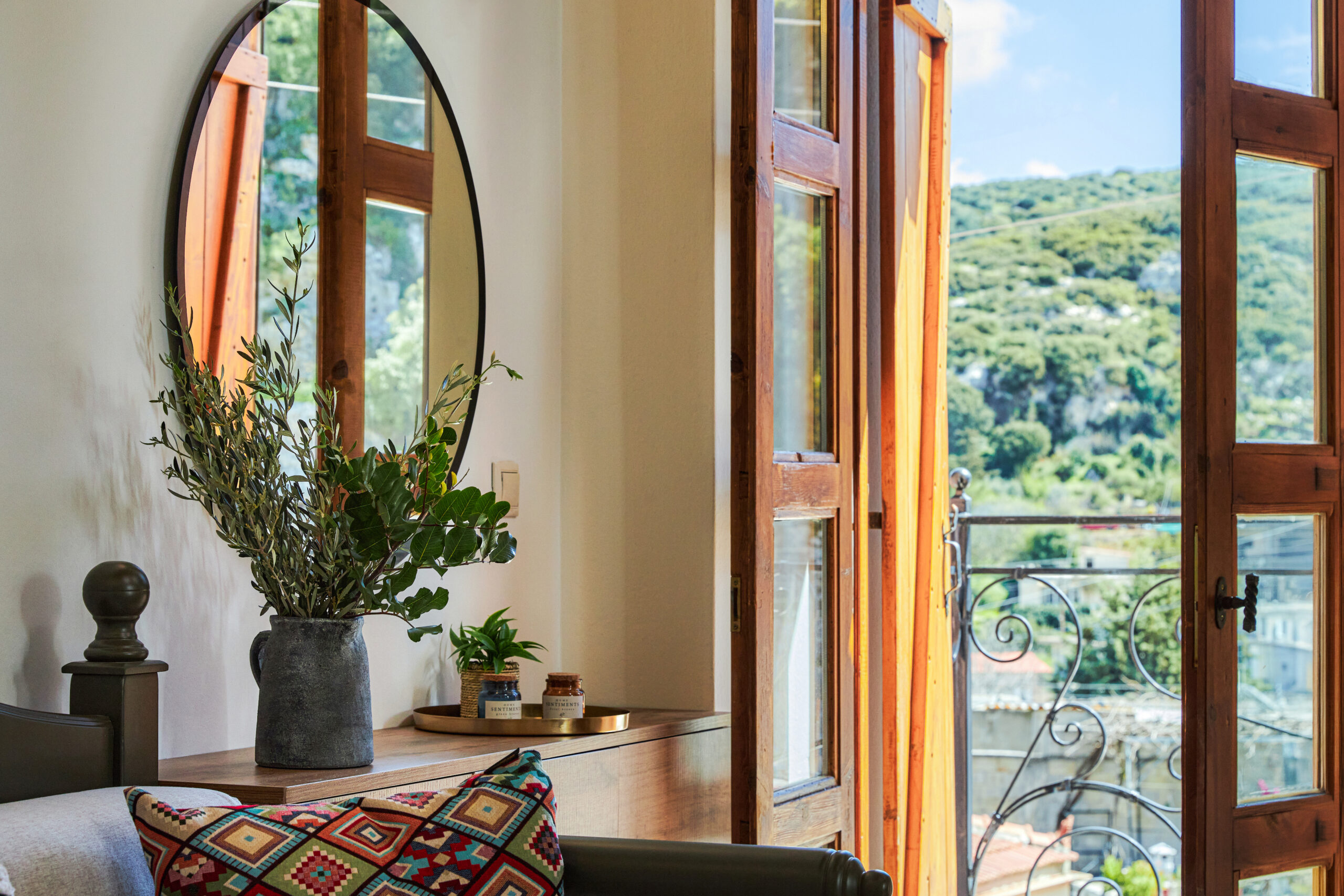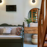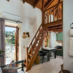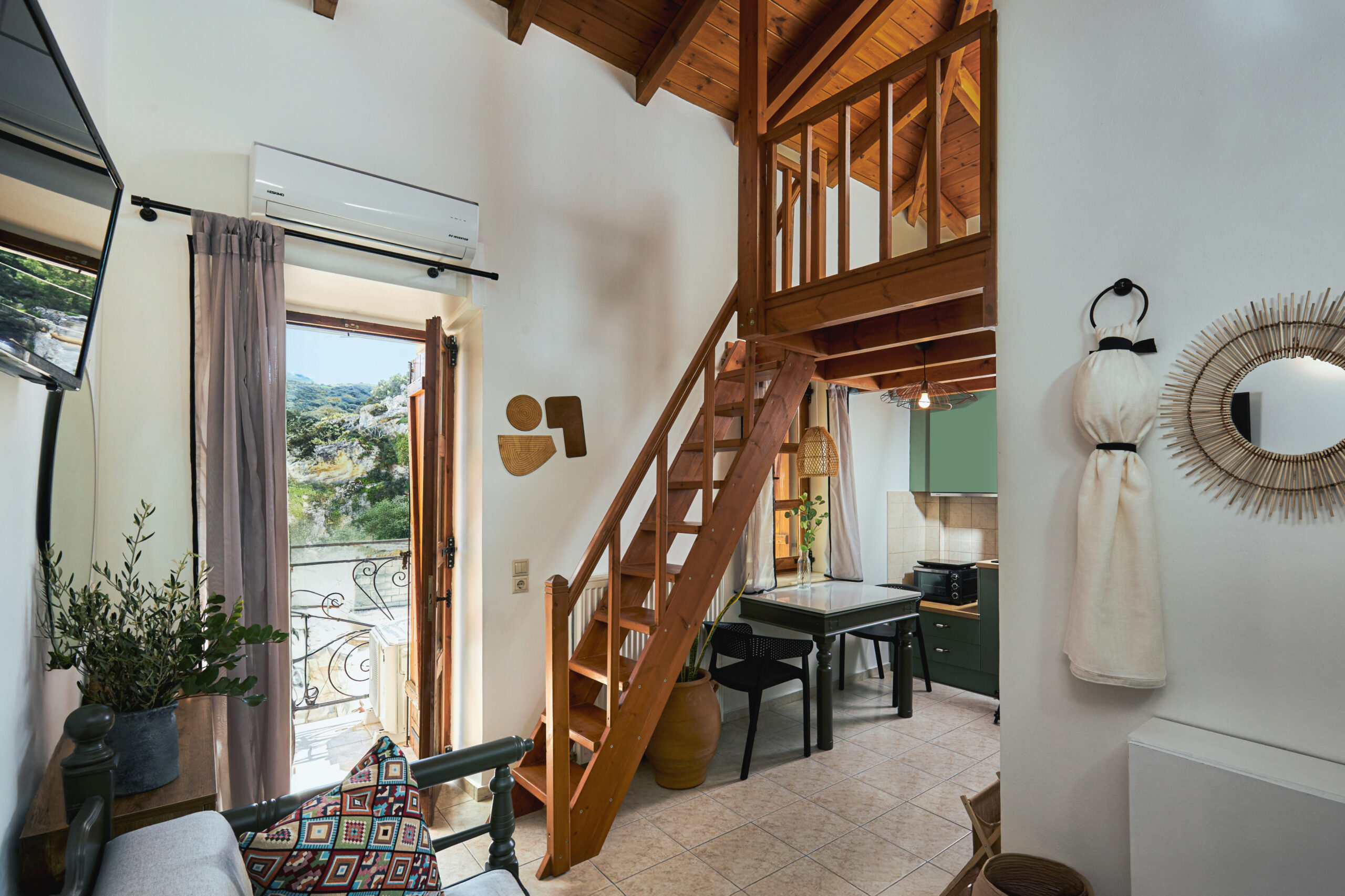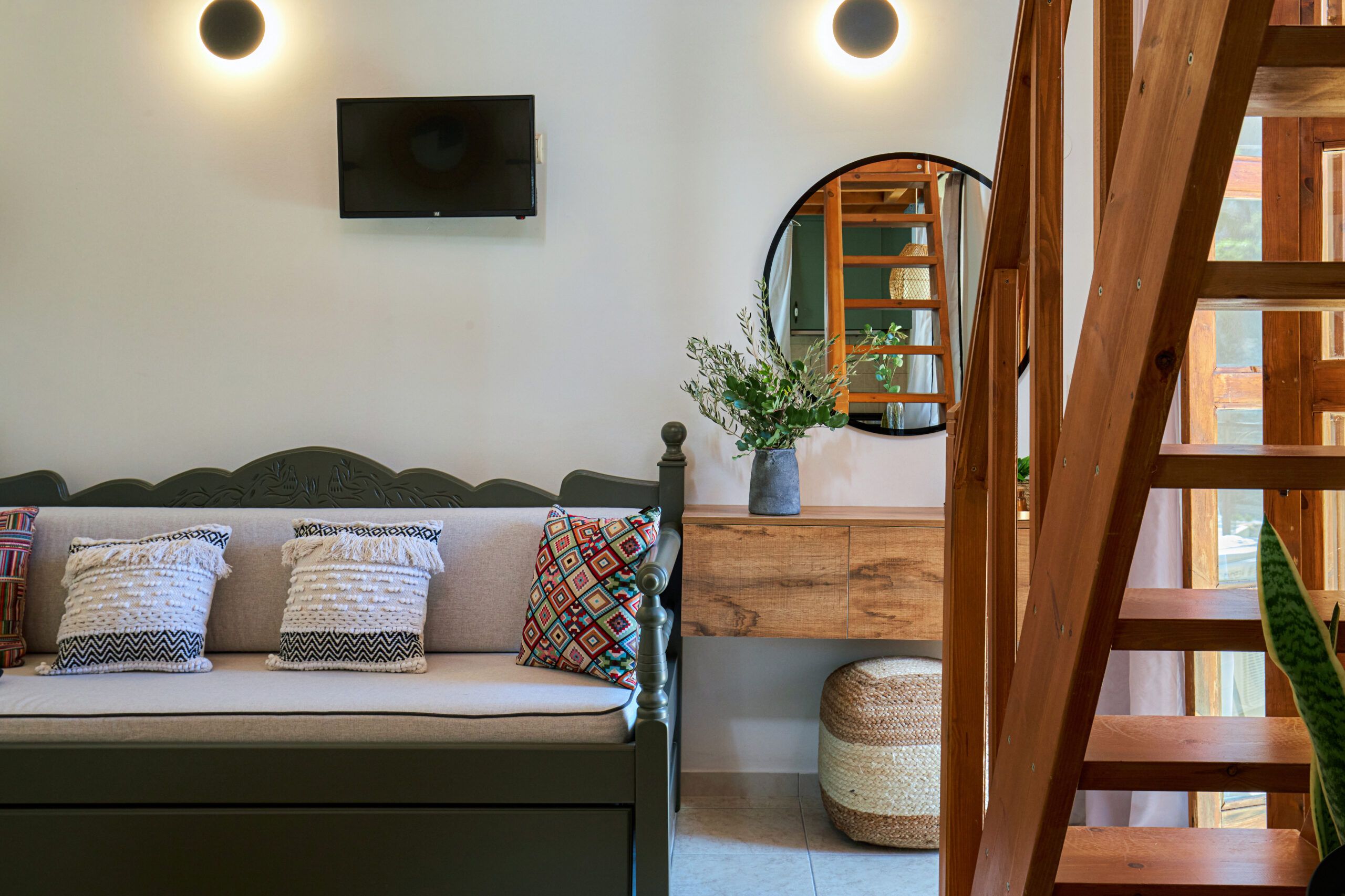 Η διακόσμηση του διαμερίσματος παραπέμπει στη γνήσια κρητική αισθητική με ξύλινα ταβάνια, χειροποίητα ξύλινα έπιπλα, παραδοσιακά υφαντά,κεντητά και πίνακες.