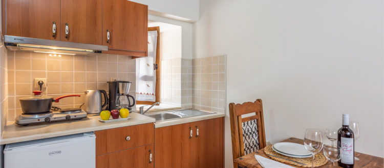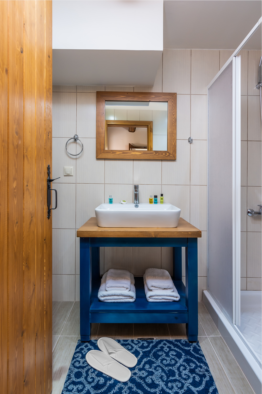 The decoration of the apartment is genuine Cretan style with wooden ceilings, handmade wooden furniture, traditional weaving, embroidery and paintings.