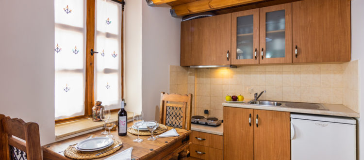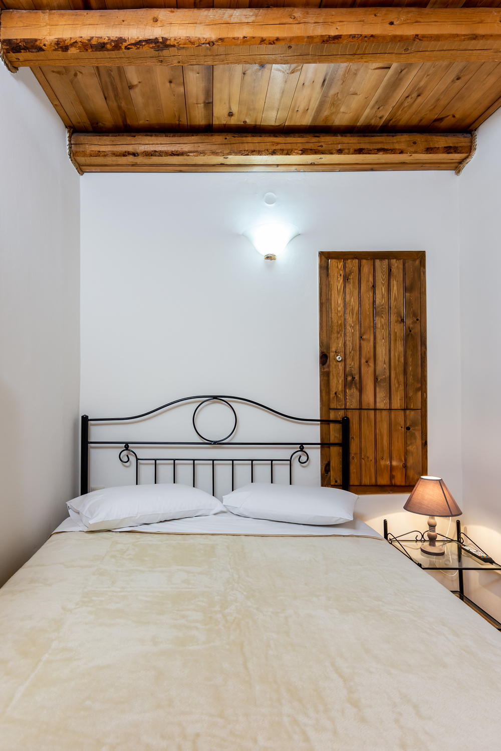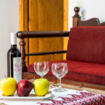 De inrichting van het appartement met echte Kretenzische stijl met houten plafonds, handgemaakte houten meubels, traditionele weven, borduren en schilderijen.